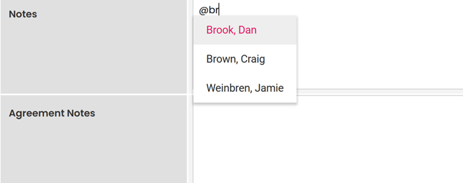 To tag a User, type in the Notes field of an Activity. Insert an @ symbol. The field will then display a list of all Users and Teams in your current Project. You can filter the list by continuing to type the name of the User or Team you wish to add (as in the screenshot below). Users will be listed with their last name first.