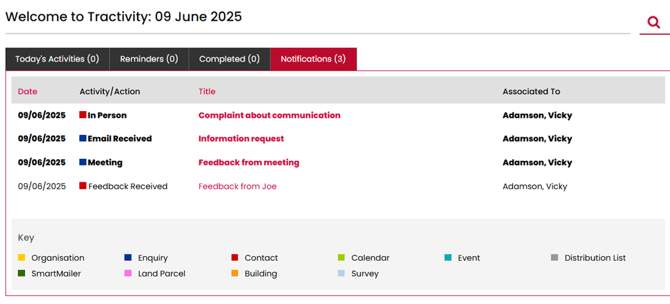 Mentions can be found on your Tractivity home page. You will see a tab called Notifications, next to the “Today’s Activities”, “Reminders” and “Completed” tabs. This will list any Activities which you have been tagged in, as well as the Activity’s Account Handler.